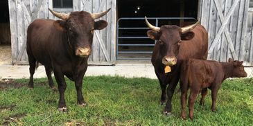 The Devon cow is especially elegant with her compact rounded form, and when treated with kindness, possesses a docile temperament. They have very few calving difficulties and adequate milk production to raise a calf and for use on the small farm. The Devon bull is noted for his ease of handling and even temperament.